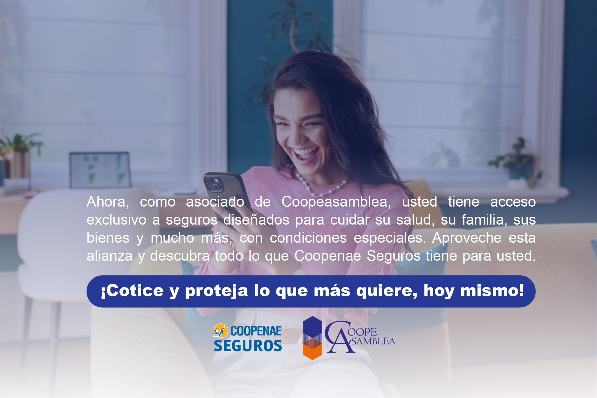 Ahora, como asociado de Coopeasamblea, tenés acceso exclusivo a seguros diseñados para cuidar tu salud, tu familia, tus bienes y mucho más, con condiciones especiales. Aprovechá esta alianza y descubrí todo lo que Coopenae Seguros tiene para vos. ¡Cotizá y protegé lo que más querés, hoy mismo!
