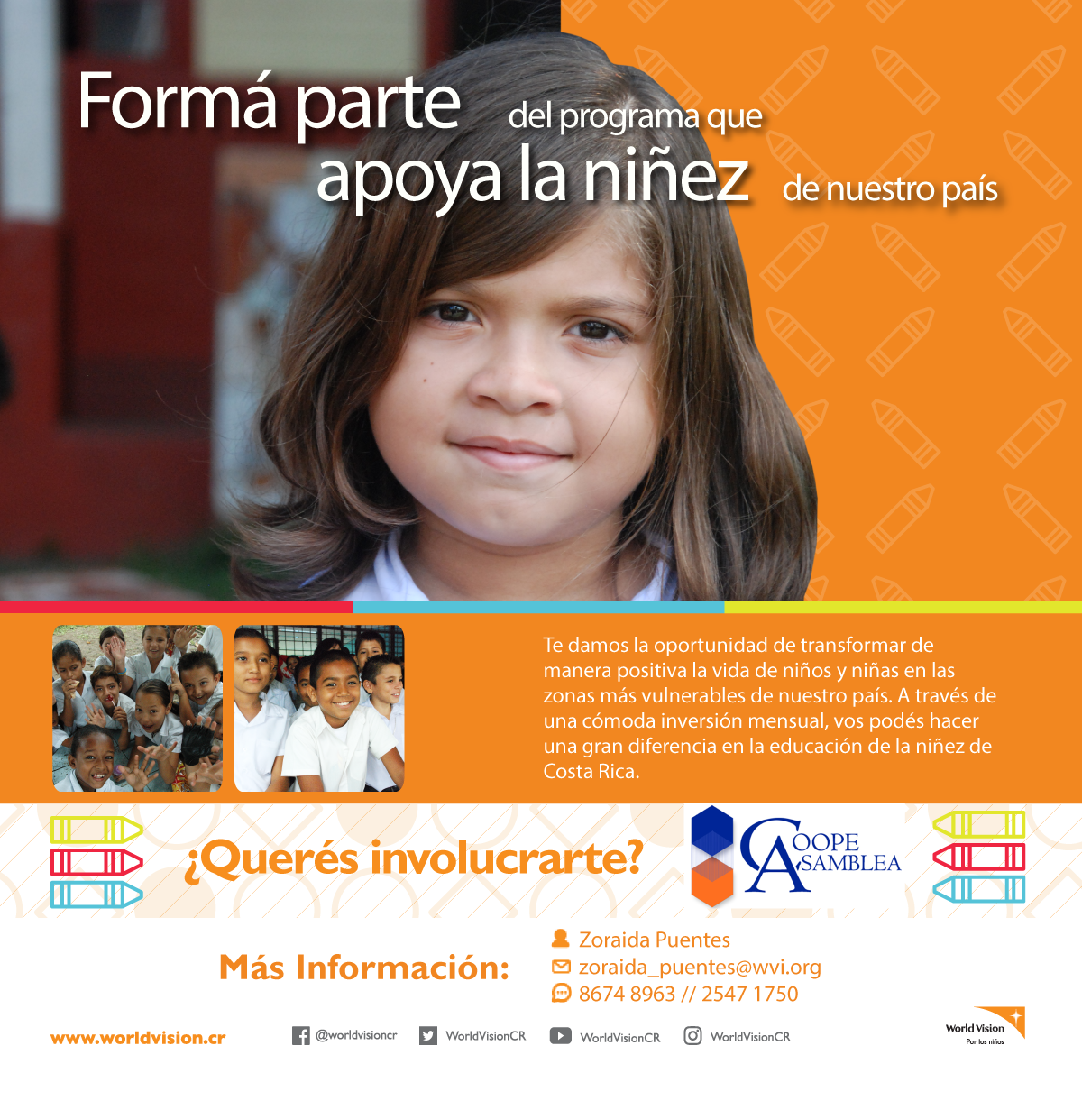 Servicios de Ayuda BeneficenciaContacto: Zoraida Puenteszoraida_puentes@wvi.orgTeléfono: 2547-1750Celular: 8674-8963Donaciones